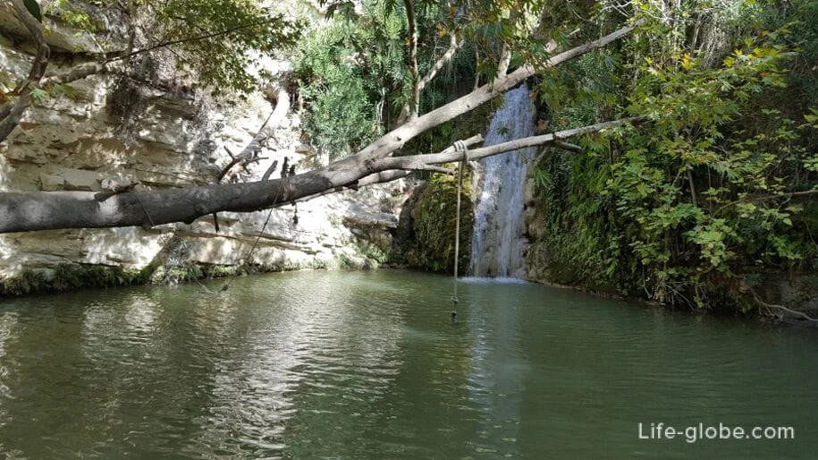 Пляж имеет протяженность 100 метров и выбивается из привычной концепции пляжей Пафоса, здесь нет ни песчаной, ни галечной полосы и удобного захода в море.