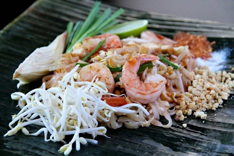 Горячее блюдо Пад Тай представляет собой обжаренную в вок-сковороде рисовую лапшу с крупными креветками или куриным филе, проросшей фасолью, перцем, луком, тофу и чесноком.