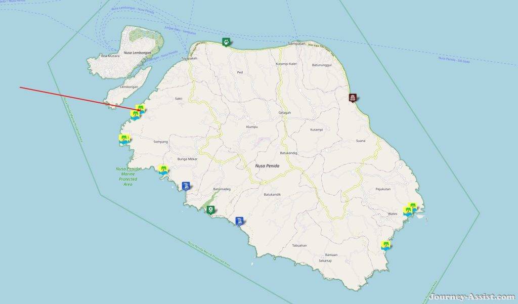 Пляж Кристал Бэй на карте острова Нуса Пенида. Бали
