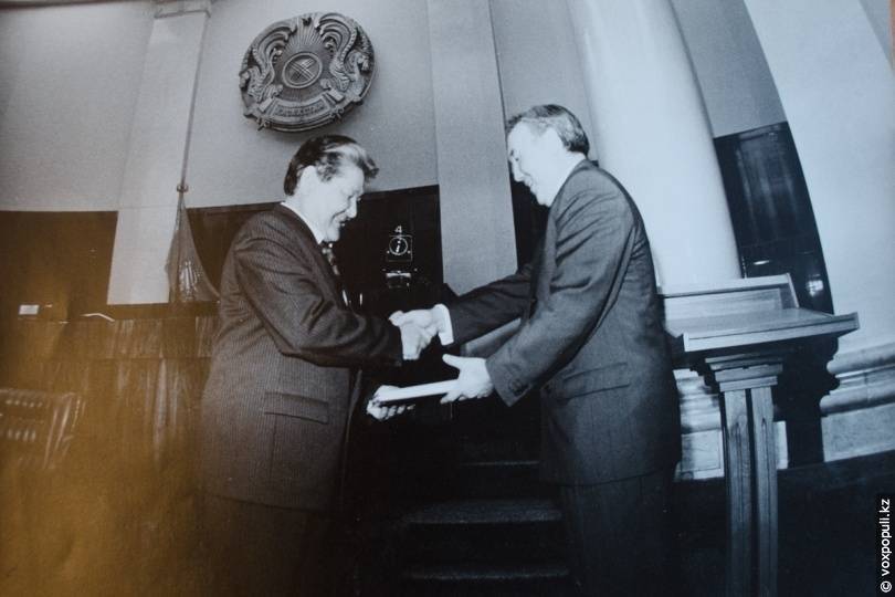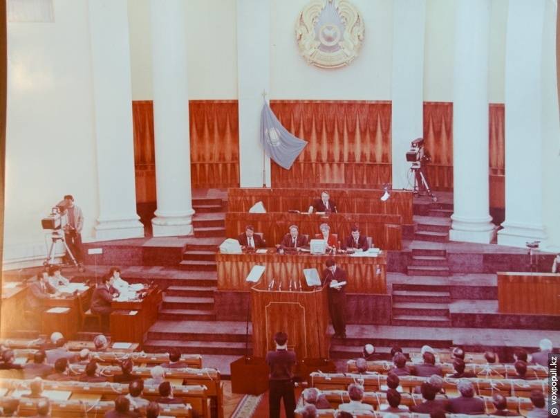— Заседание началось в 10 утра. В зале Верховного Совета присутствовал глава государства. Ближе к вечеру я вышел на трибуну и провозгласил, что депутаты приняли конституционный закон. Как председатель Верховного Совета я поставил свою подпись под постановлением о введении его в действие. Затем этот исторический документ подписал Нурсултан Абишевич Назарбаев. Зал ликовал и аплодировал. Несмотря на споры, возникшие в ходе обсуждения закона, все встретили его с большим энтузиазмом.