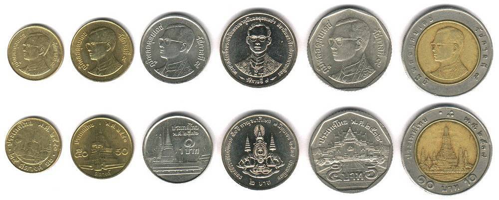 Помимо бумажных денег в Таиланде имеют хождение также металлические монеты: баты и сатанги. 1 тайский бат состоит из 100 сатангов. Активно используются в расчетах монеты номиналами: 10 бат, 5 бат, 2 бата, 1 бат, 50 сатангов, 25 сатангов. Монеты номиналами менее 25 сатангов ЦБ Таиланда выпускает, но ограниченным тиражом из-за низкого спроса на них.