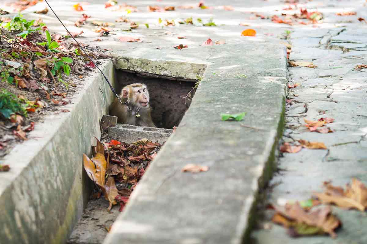 Подошла ближе, а обезьянка, увидев меня, испуганно спряталась в канаву.