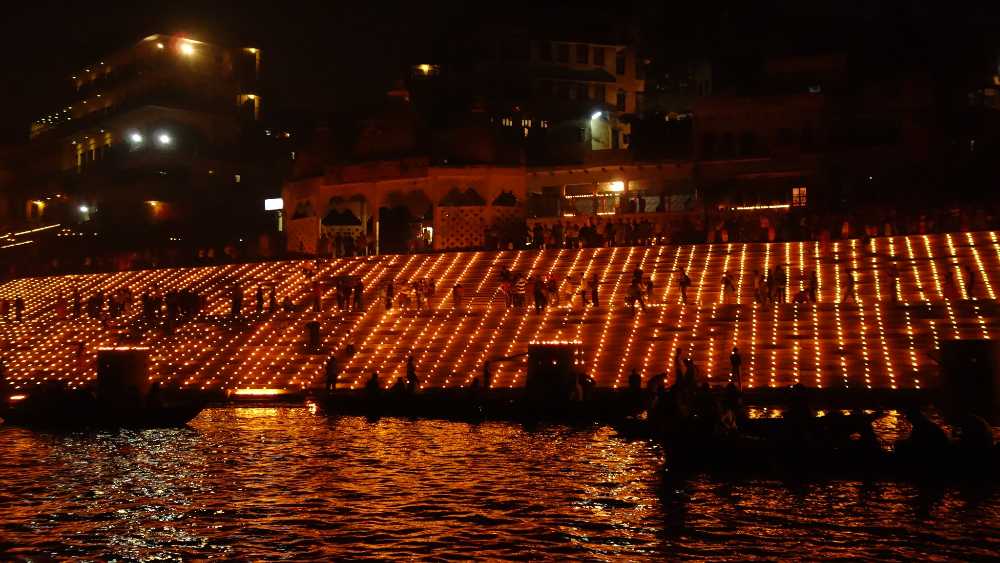 Постоянный поток петард осветил небо над рекой Ганга, когда город утонул в свете.