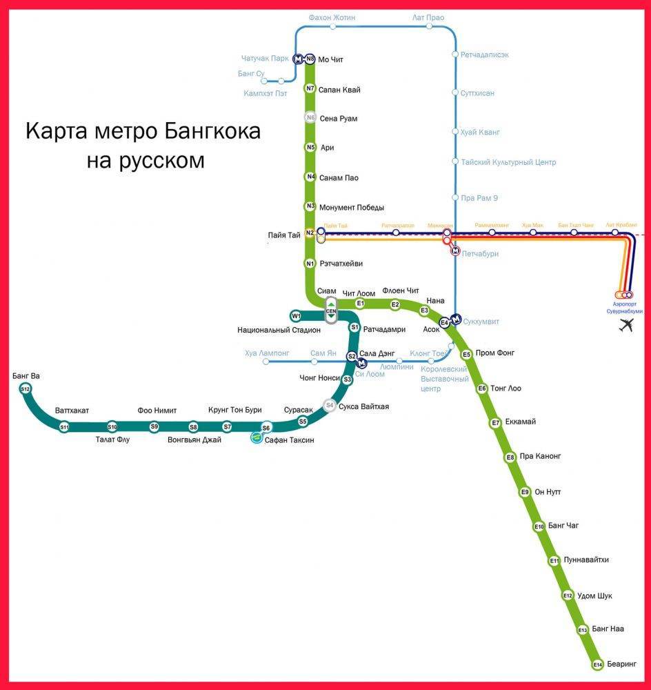 Схема надземного метрополитена простая, интуитивно понятная и обозначена тремя цветами: синим, салатовым, зеленым. Недавно на схеме появилась еще одна линия фиолетового цвета. Наименований станций метро Бангкока обозначается буквой, которая означает сторону света, а также цифрой – расстояние в километрах от центральных районов столицы.