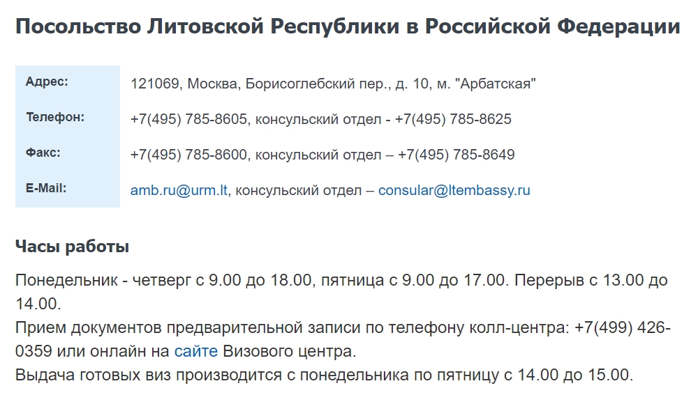 В посольстве также можно оформить визу. Даже можно сэкономить. Здесь не возьмут сбор за сервис. Схема как попасть сюда аналогичная визовому центру, телефонный звонок или заявка через интернет. Заранее записываться на прием не нужно лицам, литовской национальности, а также членам литовской семьи.