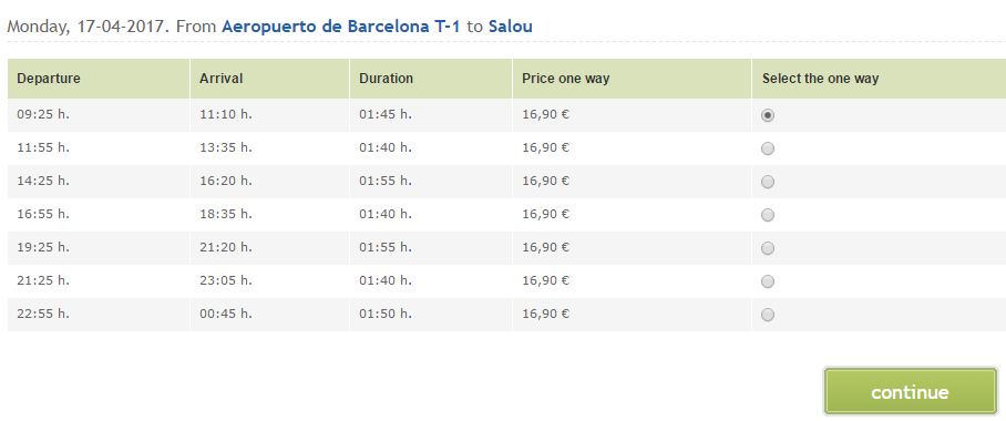 Если же вы решили приобрести билет он-лайн, на главной странице сайта справа введите пункт отправления (Barсelona) и пункт прибытия (Salou), а также дату поездки и количество мест. Из предложенных вариантов нужно выбрать один подходящий (а также застраховать свой багаж) и внести личные данные. Оплата производится дебетовыми или кредитными картами.