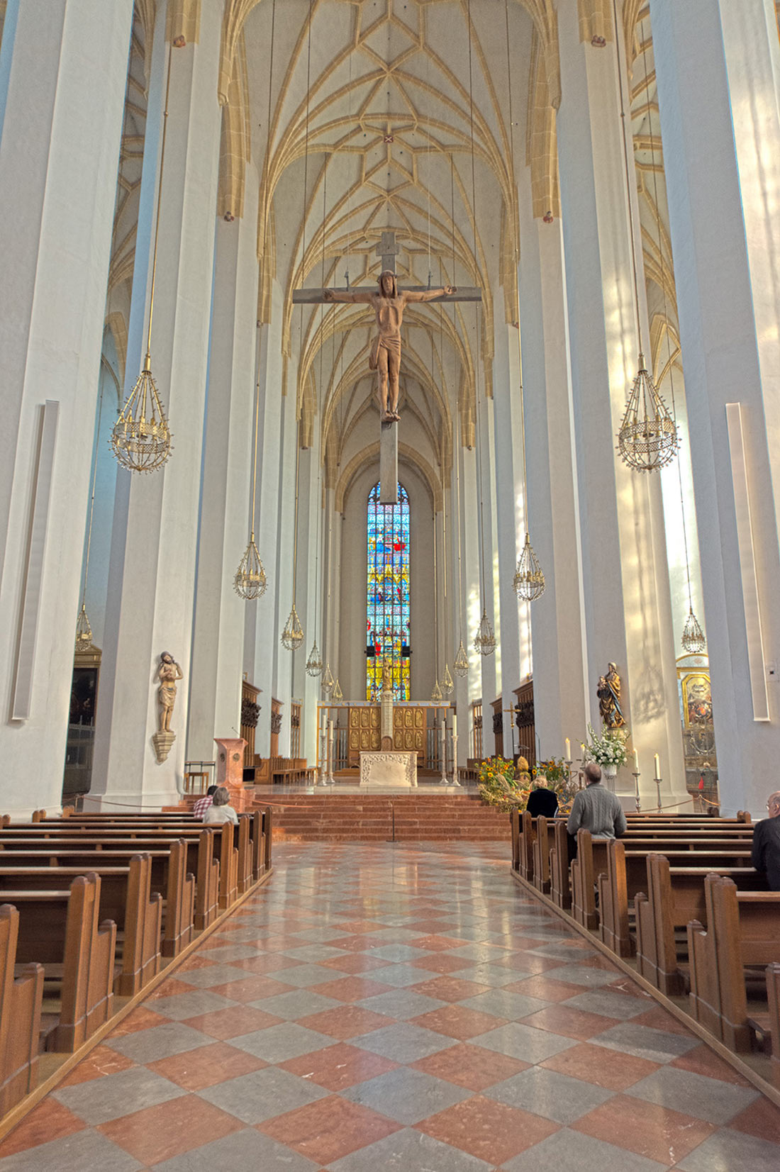 Культовые башни с куполами являются наиболее характерной частью городского пейзажа Мюнхена. Собор был построен в конце XV века. Здание сильно пострадало от авиаударов во время Второй мировой войны, но его постепенно восстановили. Здесь находится могила Людвига Баварского. Поднимитесь на южную башню, чтобы полюбоваться видом на Мюнхен и увидеть Альпы! Кроме того, в интерьере самой высокой церкви Мюнхена можно увидеть легендарный… «след дьявола» — отпечаток мужского ботинка на плите. Легенда гласит, что архитектор заключил сделку с дьяволом: чтобы последний не мешал строительству, ему было обещано не делать в соборе окна. Если выбрать правильный ракурс, то колонны действительно скрывают окна так, что их не видно.