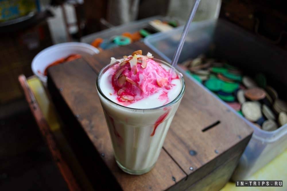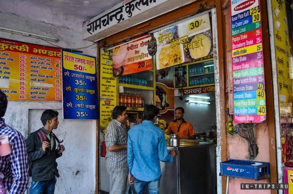 За тридцать рупи в вашем стакане окажется чудесный и изумительно вкусный ласси с мороженым, ингредиенты просты, ласси + один шарик сливочного мороженого + щепотка орехов кешью + ложка изюма + изрядная порция сладкого сиропа. Процесс производства ласси в этой лавке не такой колоритный как в кафе Blue Lassi, что расположен в Варанаси, но все готовят при вас и очень быстро. Сначала следует купить жетон у кассира, а после с этим жетоном идти к продавцам, система дурацкая, но так продавец не пачкает руки от денег, а это уже хороший знак.