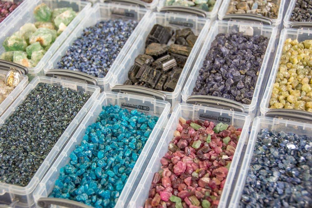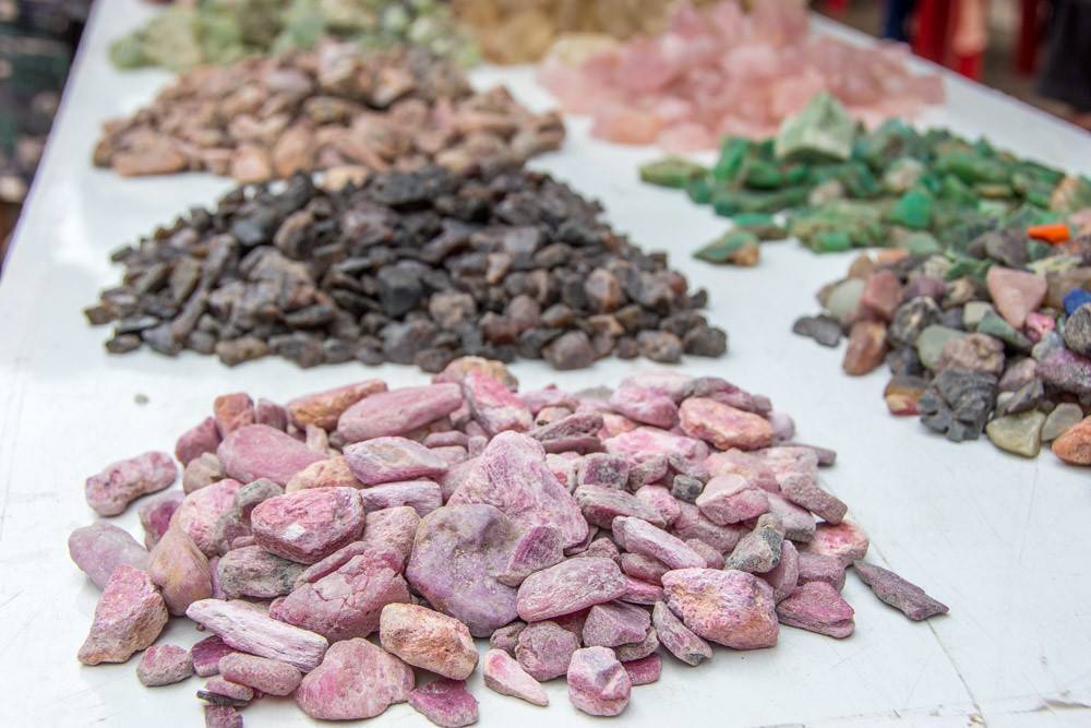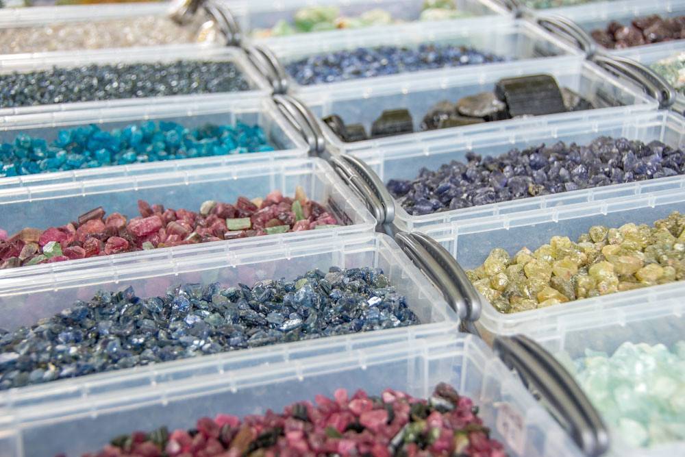 Разным. От зеленых и коричневых жадеитов до сиреневых аметистов, розовых кварцев, голубых топазов, желтых цитринов, цветной шпинели. Есть все.