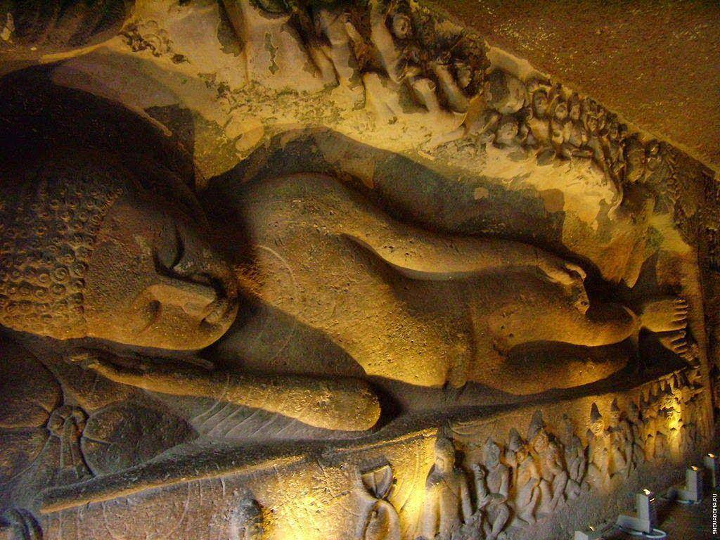 Интересны в Аджанте чайтьи, которых тут много, некоторые украшены прекрасной резьбой, другие росписями. Причем резьба здесь на мой взгляд интересней и фресок и рельефов полее поздней по времени строительства Эллоры. Наибольшее впечатление на меня произвела пещера № 26. Это чайтья. По левую сторону от входа, головой ко входу лежит спящий или ушедший в нирвану гигантский семиметровый Будда, отгороженный от центрального зала колоннами и просто не влезающий в кадр. В его ногах сюжеты из его жизни. Рядом с чайтьей слева сидящего на возвышении в позе медитации Будду обступили красавицы, целая толпа прекрасных женщин, группа просто потрясающая. Эти красавицы почти стерли у меня все предшествующие впечатления, а больше открытых для осмотра пещер в Аджанте нет. Из 28 имеющихся пещер 4 или 5 закрыты на реставрацию