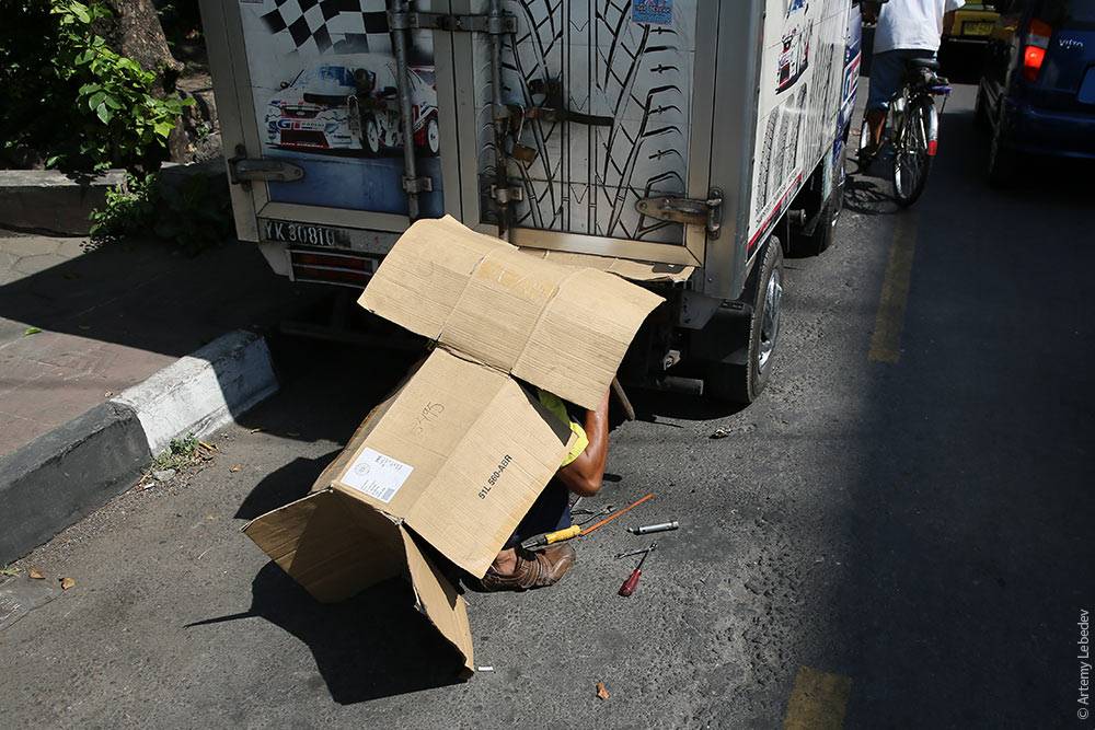 Водитель чинит машину, прячась от палящего солнца под листами картонной коробки.