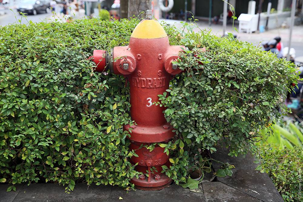 Голубые бетонные пеньки обозначают вентили пожарных гидрантов.