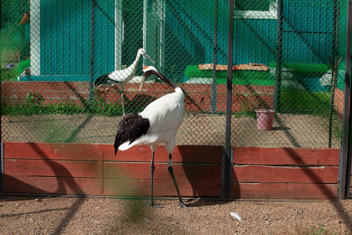 В крайнем вольере сидит пара журавлей, которые вырастили уже не одного птенца: при этом оба они попали в питомник больными и неспособными выжить в природе. Самку со сломанным крылом привезли зимой, подобрали в районе Муравьевского парка.