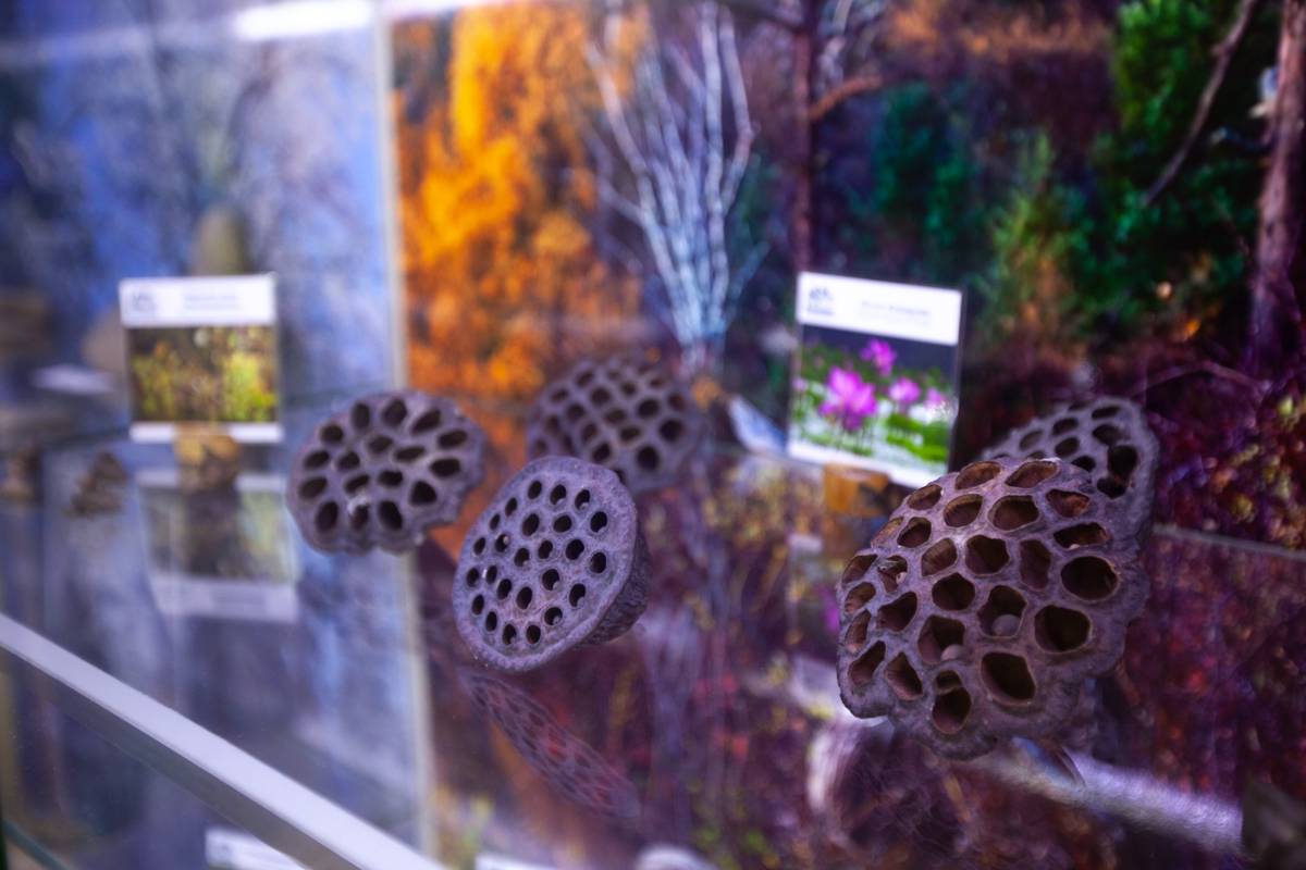 Небольшую экспозицию со спилами различных деревьев и шишками украшает огромный древесный гриб размером с два альбомных листа. По словам Татьяны, не все посетители знают, что эти грибы зачастую паразитируют на деревьях и губят их. Отдельно представлены высохшие коробочки лотосов: сердцевинки, в которых после цветения образуются орешки — это один из способов размножения лотоса Комарова. Здесь же лежат несколько видов высохших водяных орехов. «В Амурской области — северный ареал лотоса, севернее они уже не растут, — объясняет специалист отдела экопросвещения. — Это теплолюбивые растения, поэтому из за холодной, дождливой погоды, поздней весны лотосы зацветают позднее».