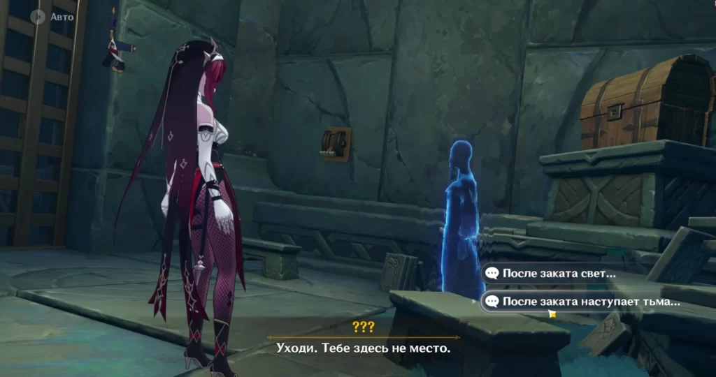 Затем снова переключитесь на Вечную ночь. Спрыгните вниз в отверстие на полу и поднимитесь по каменной лесенке. Далее поговорите с призраком в укрытии. Во время разговора необходимо выбрать вторую фразу: «После заката наступает тьма…»