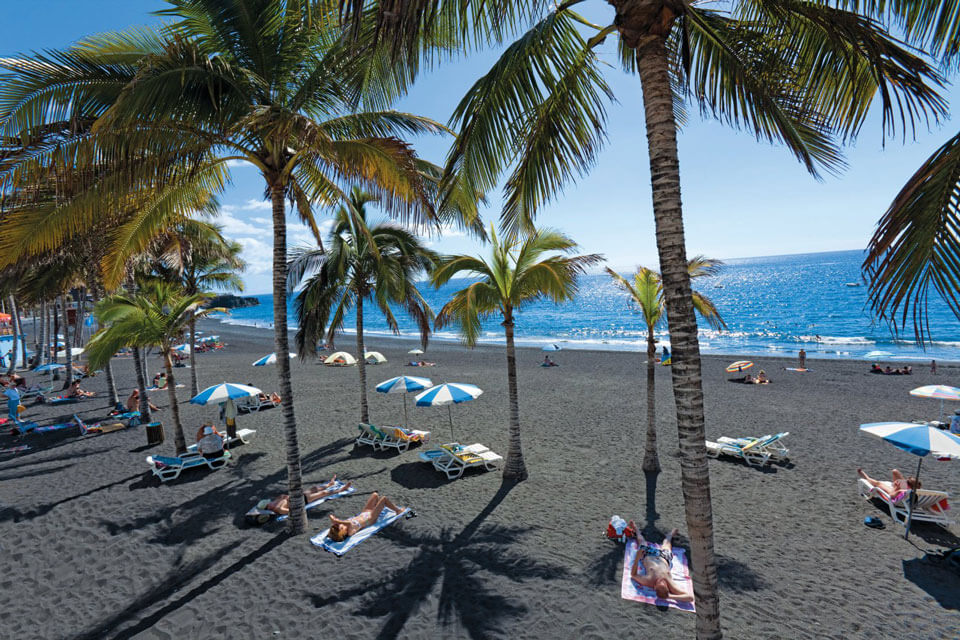 Побережье Ла Пальмы — это спускающиеся к волнам Атлантического океана крутые скалы, поэтому мест для купания здесь немного. Желающим поплавать и позагорать на сером вулканическом песке лучше выбрать для отдыха западную оконечность острова. Самый знаменитый местный пляж — окруженный кокосовыми пальмами Puerto Naos — оборудован удобными шезлонгами, душевыми, раздевалками и барами.