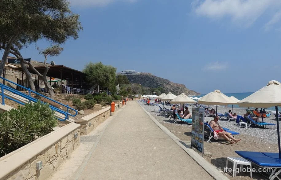 Второй недостаток — здесь мало баров и кафе на самом пляже. За напитками приходится ходить через дорогу — улицу 28-го Октября (28th October avenue). Движение по этой улице слабое, но всё равно приятного мало.