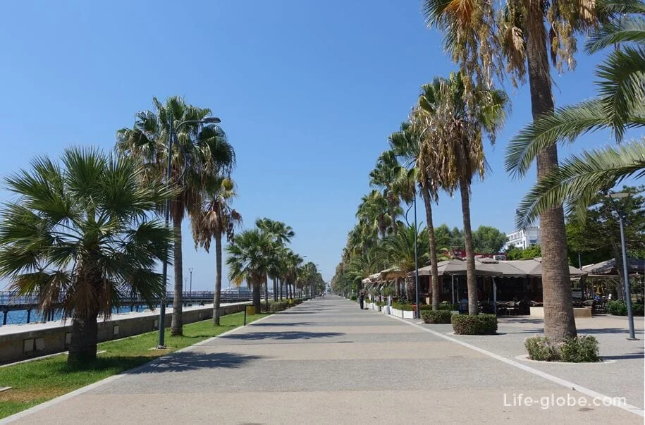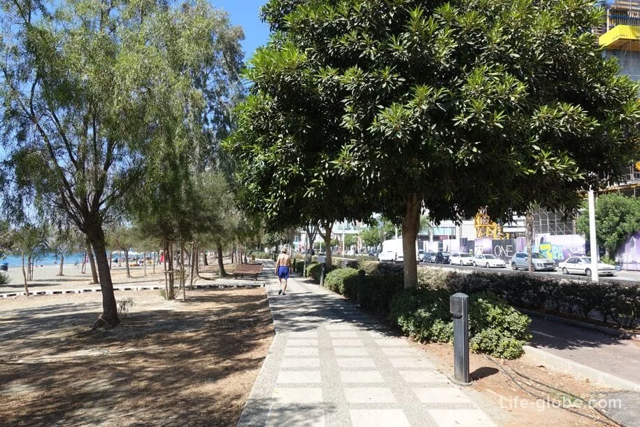 Променад вдоль центрального пляжа Лимассола (Акти Олимпион), где есть несколько кафе и пляжных баров, также оборудованы места для отдыха в тени раскидистых крон хвойных деревьев.
