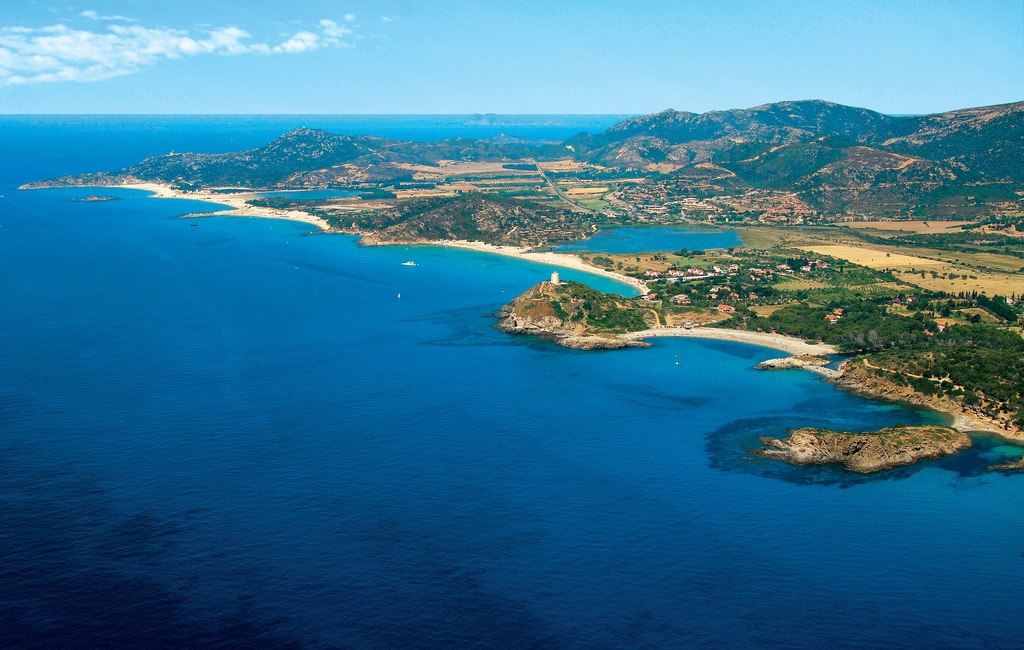 В Вилласимиус на востоке от полуострова находятся пляжи Timi Ama, Cava Usai, Simius, Porto Luna, Accu is Prezzus и Punta Molentis.