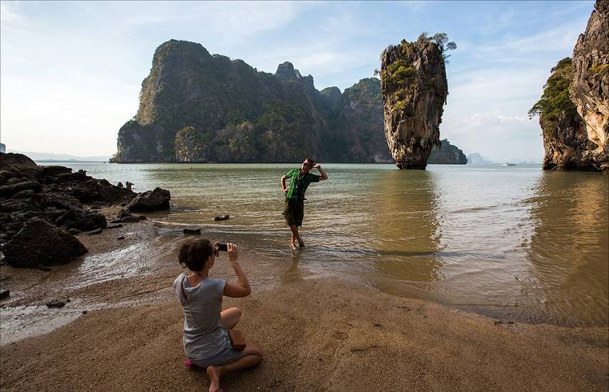 Напротив, Кхао Пинг Кан принимает сотни туристов ежедневно. На острове организована пляжная линия, с которой открывается потрясающий вид на «гвоздь» программы.