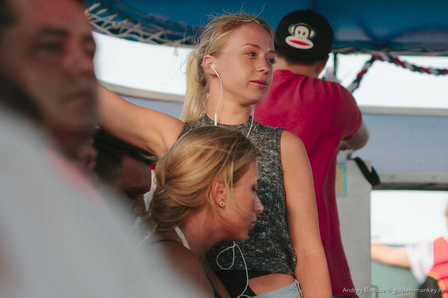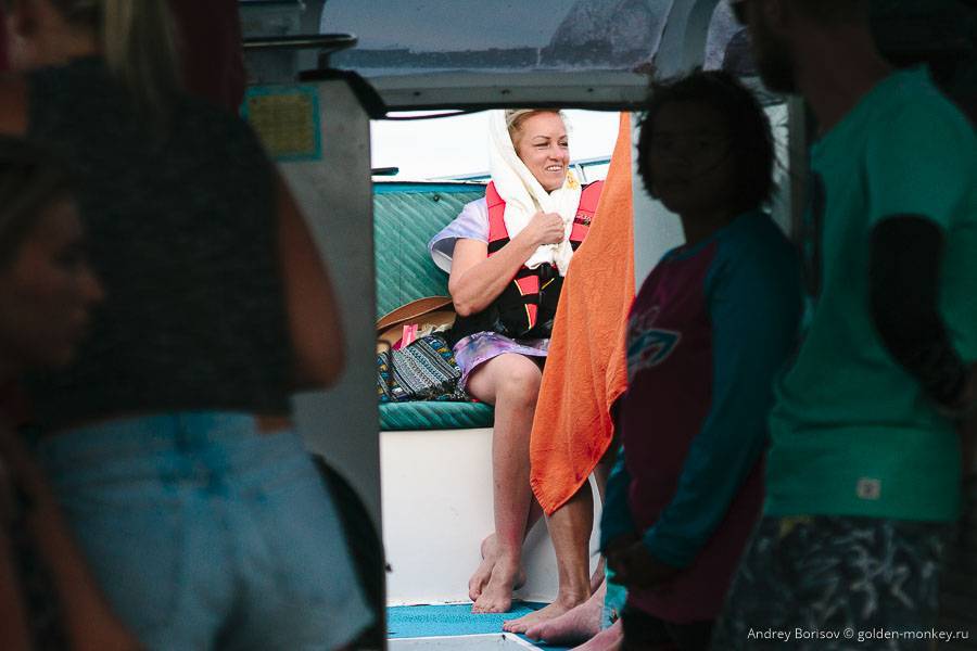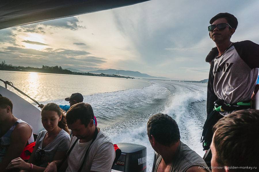 Где-то ближе к островам поднялись волны, из-за которых внутрь лодки, несмотря на крышу, залетали брызги, так что те, кто сидел ближе к корме, к концу поездки были все мокрыми. Кто-то укрывался от брызг спасательным жилетом, а кто-то просто снял майку и дремал со счастливым лицом. У меня в руках был фотоаппарат, чудом его не намочил. Хорошо еще, что тепло.