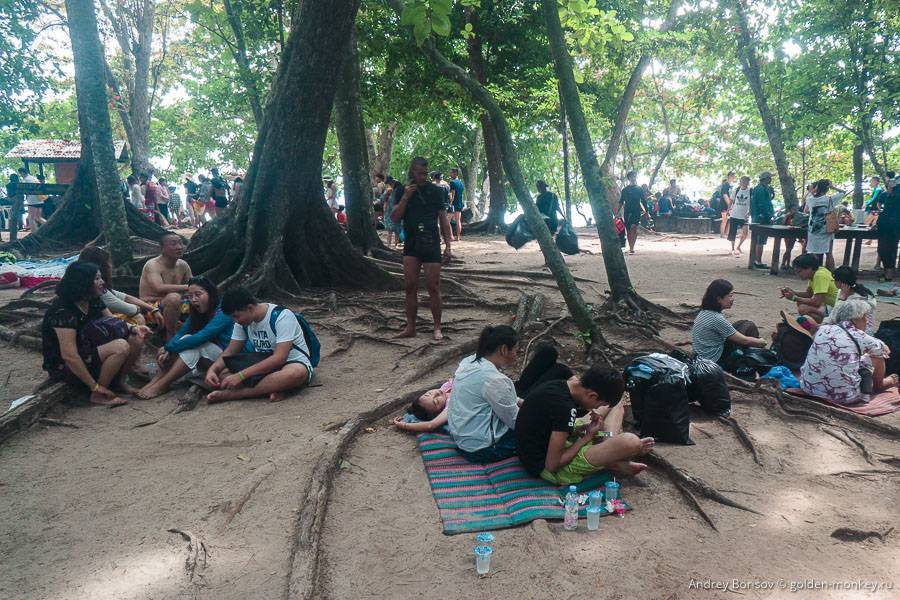 Прибежали на «Пляж молодоженов». Почему он так называется, я точно не знаю, но наверно потому, что он очень тенистый и узкий. Весьма интимный — как раз было бы неплохо парочке (нам, например) спрятаться от всех где-нибудь в неприметном закутке. Однако, не тут-то было! Все возможные закутки заняты сотнями других туристов, причем эдак процентов на 90% из Поднебесной.