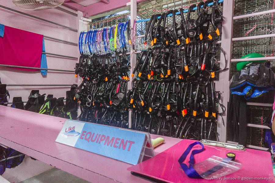 Так как в программу входит снорклинг (плавание на поверхности с маской), необходимо оборудование, как минимум — маска с трубкой, как максимум — предлагают еще и ласты с полотенцем. Я думал, что всем вручат какие-нибудь дешевые китайские маски, которые на пляжах сдаются в аренду (и которые можно самому здесь купить за 300-500 бат), но нет, эти оказались удобными, с закаленными стеклами.