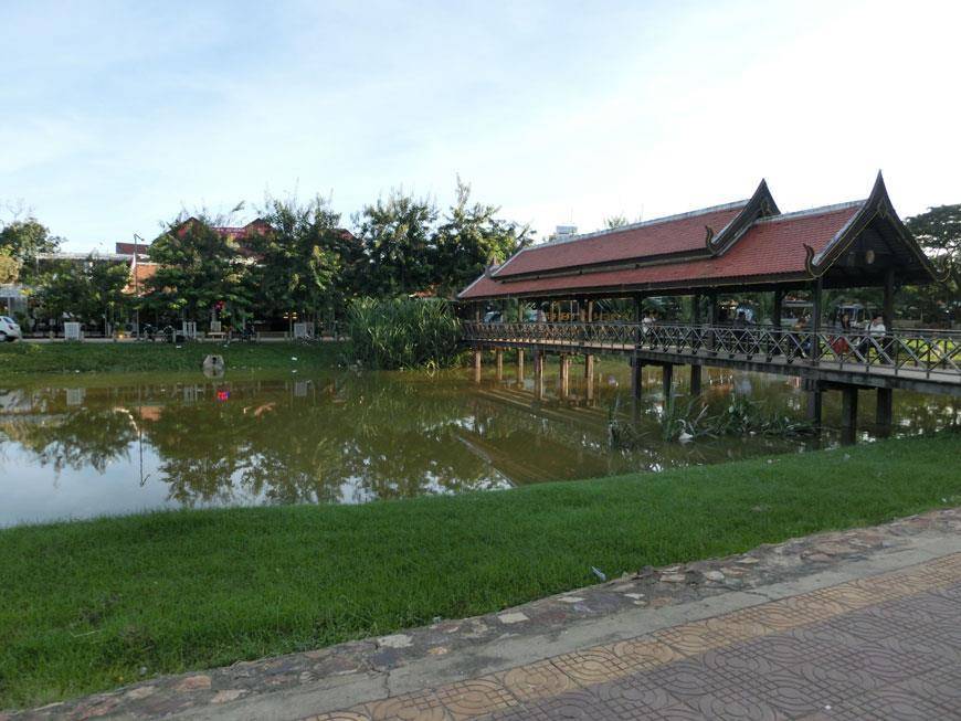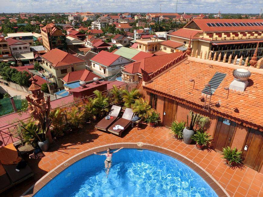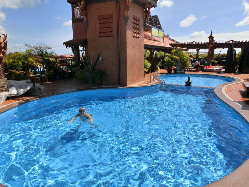 Трёхэтажный отель неплох, сделан в стиле ангкорских построек, обсажен всякими экзотическими растениями, в том числе деревьями путешественников. Имеется бассейн, в котором я не преминул искупаться. Хорошо, только вода малость зацвела, хотя и пахнет хлоркой.