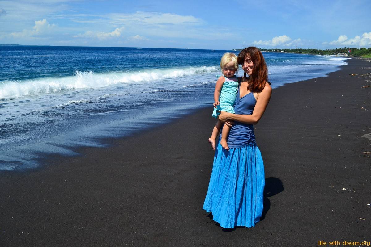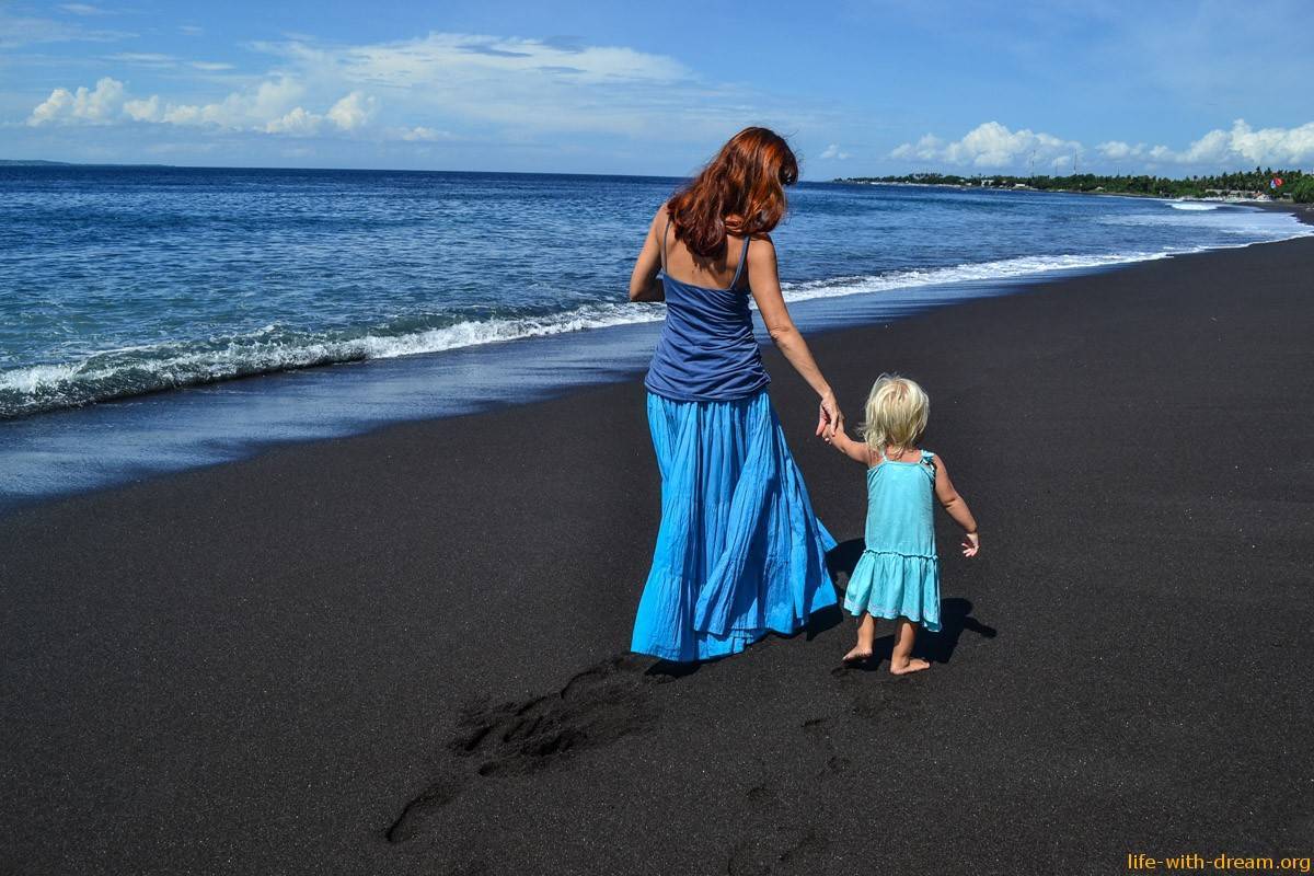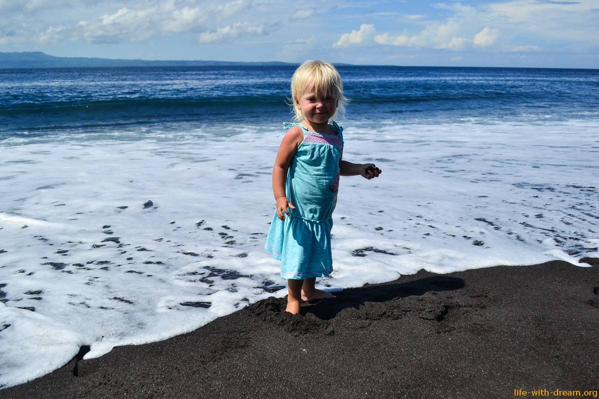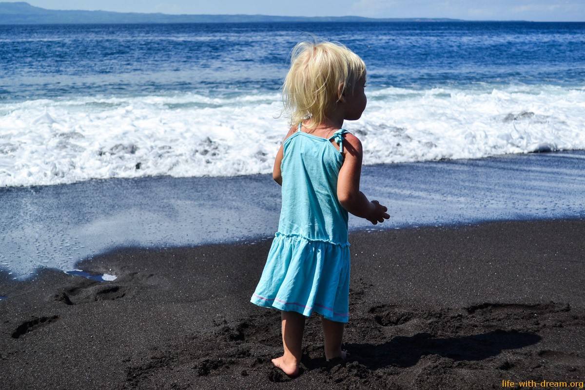 Ярославушка гуляла на этом пляже с черным вулканическом песком, когда ей было всего два месяца. Сейчас ей один годик и четыре месяца, и она гуляет по нему опять, но с неким удивлением: “Ого, вот это песочек, мам, смотри”