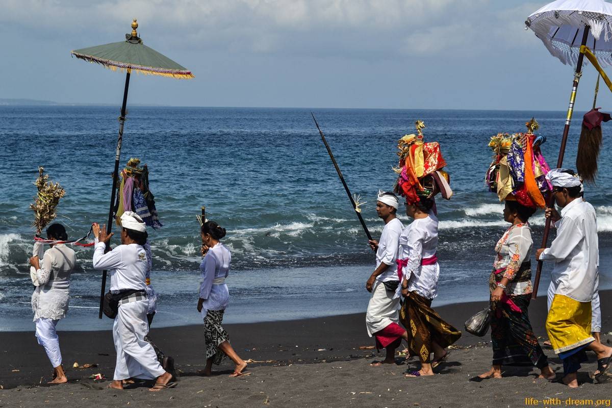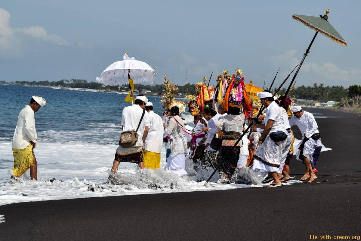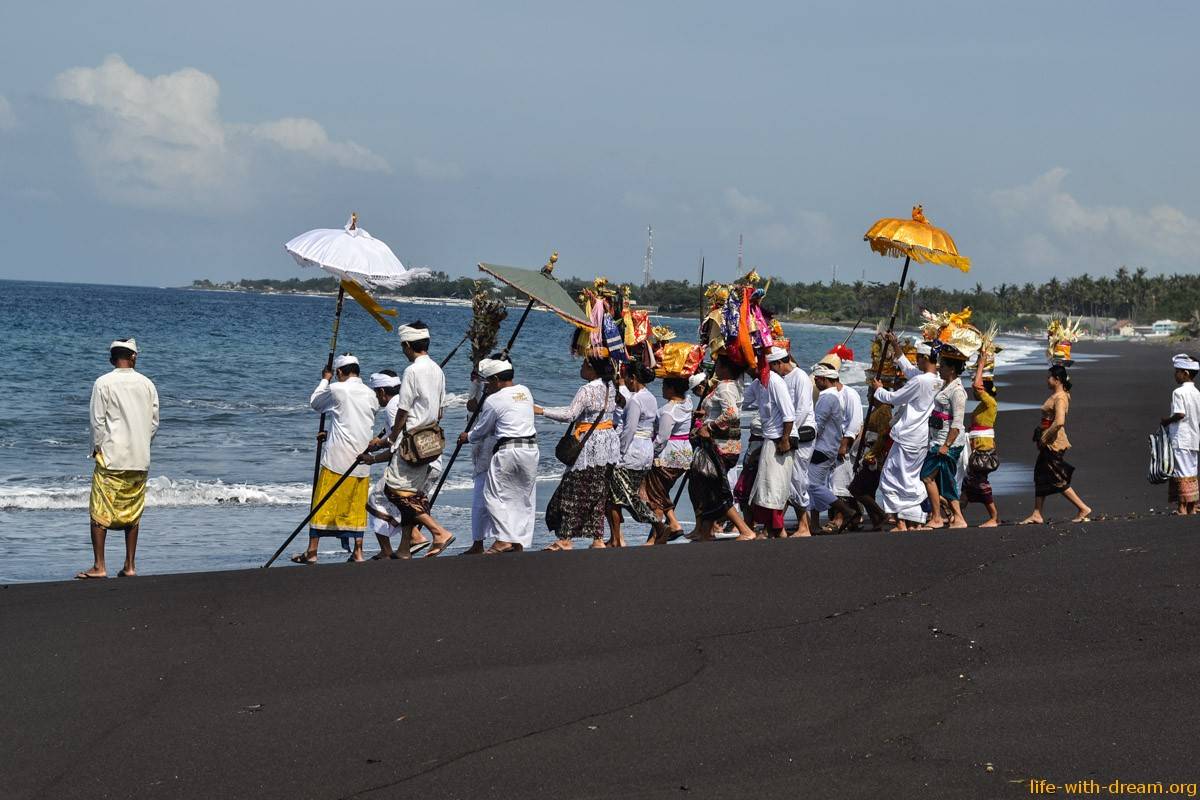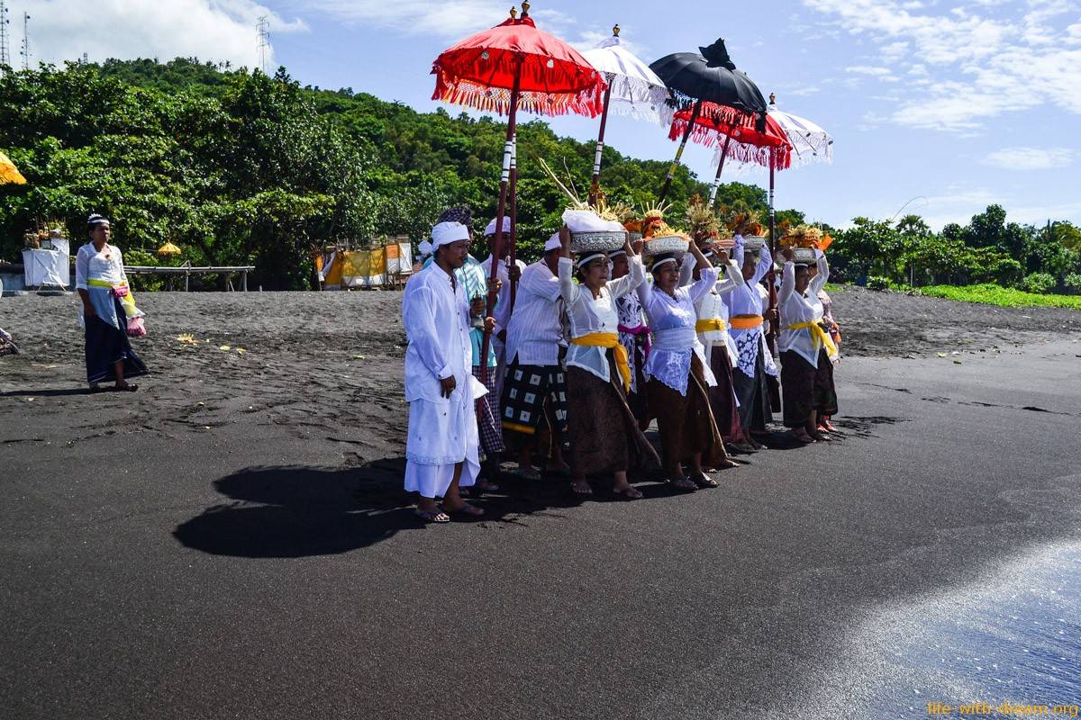 Здесь всегда проходят различные балийские ритуалы благодарности океану. Рядом с океаном стоят алтари. Женщины приносят сюда подношения, зажигают благовония, молятся. В бамбуковых корзиночках чананг лежат цветы и церемониальные травы.