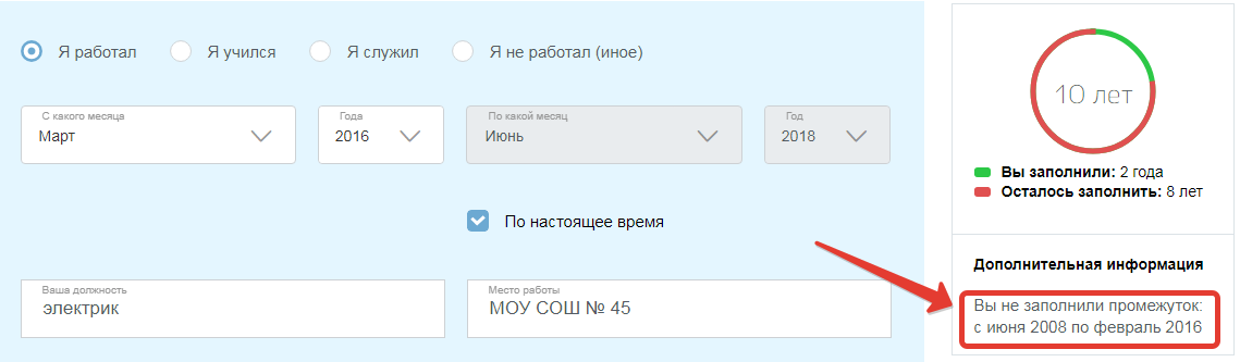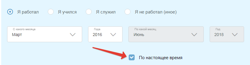 Вносить информацию можно в любом порядке. Однако, чтобы не запутаться, удобно начать с последнего вида деятельности, указав дату начала и поставив галочку в пункте «По настоящее время». Затем заполняйте по убывающей. Воспользуйтесь записями в своей трудовой книжке, чтобы всё верно заполнить. Точный адрес организации можно найти в интернете.