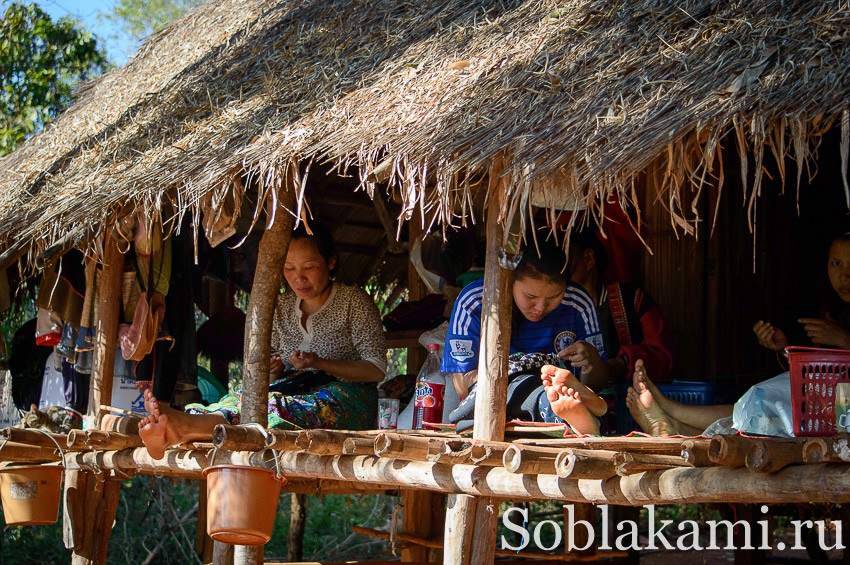 В деревне в основном женщины. Они вышивают тканые сумки и кошельки на продажу туристам.