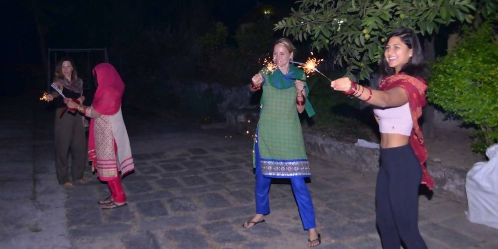 Наслаждаясь фестивалем: Дамы наслаждаются фестивалем Дивали, зажигая Спарклер среди других петард.