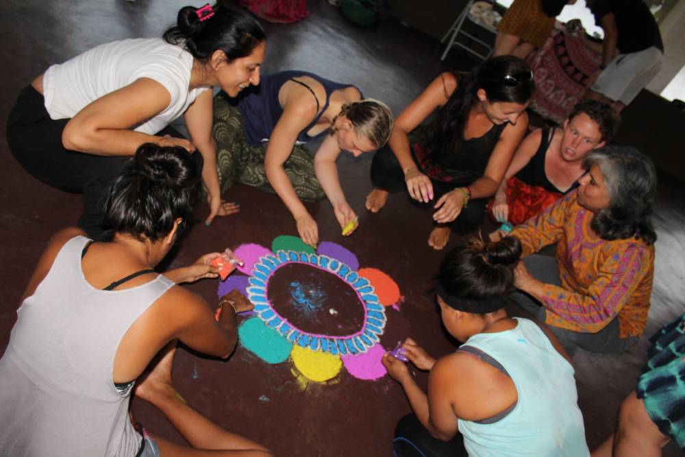 Время Ранголи: Женщины, посещающие Индию, помогают в создании великолепного Ранголи в рамках подготовки к Дивали.