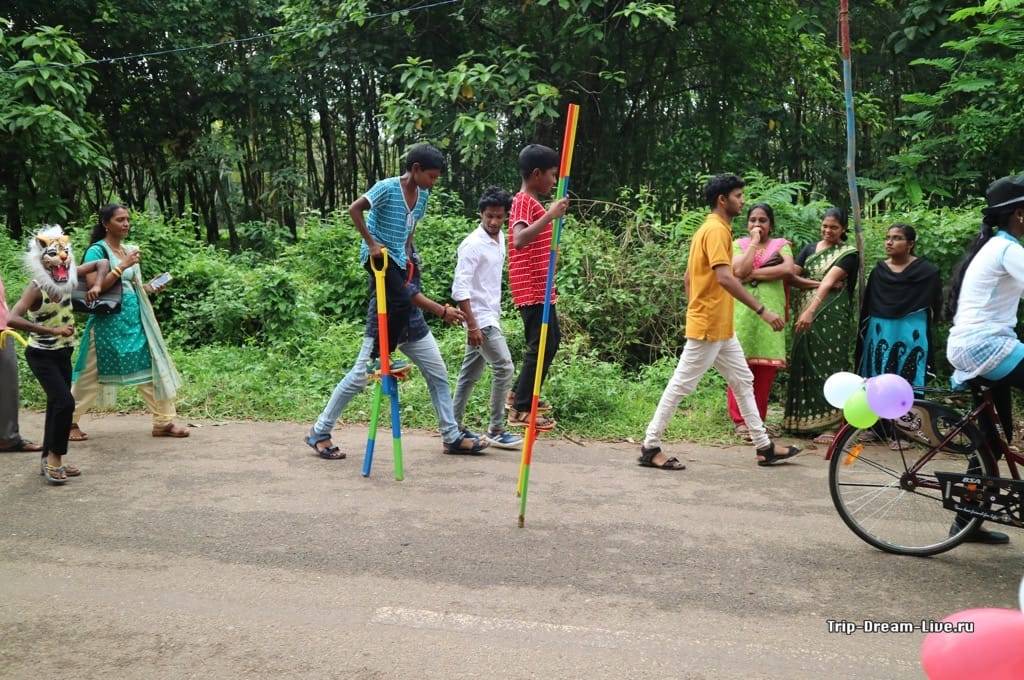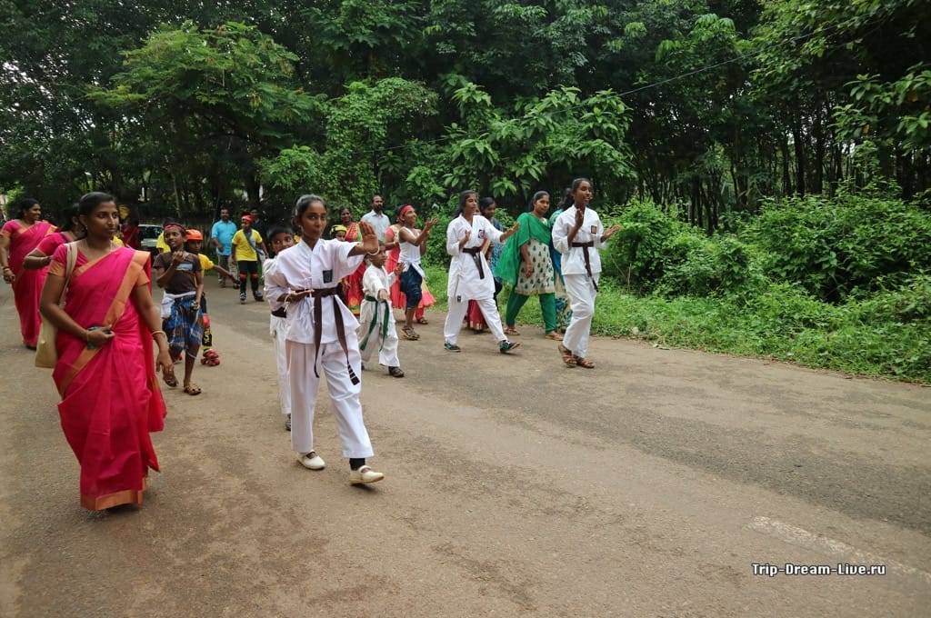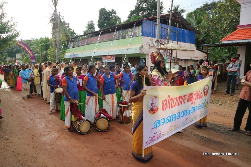 Мы оказались на параде в честь возвращения царя Махабали с нашим ашрамом, в котором мы сейчас живем. У нас был свой «царь Махабали», а так же были барабанщицы, которые подготовили целый номер для приветствия своего обожаемого царя.