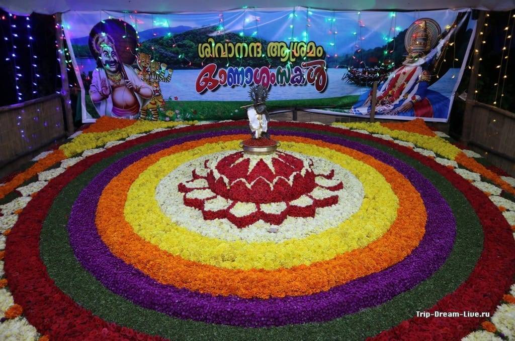 Часто индийцы выкладывают поразительной красоты цветочные ковры онам пуккалам: собирают такие цветы в удивительный рисунок дети, а чаще всего девочки. Редко такие ковры бывают меньше полутора метров в самом узком месте. Между цветами расставляют яркие светильники, а над ковром протягивают яркие гирлянды.
