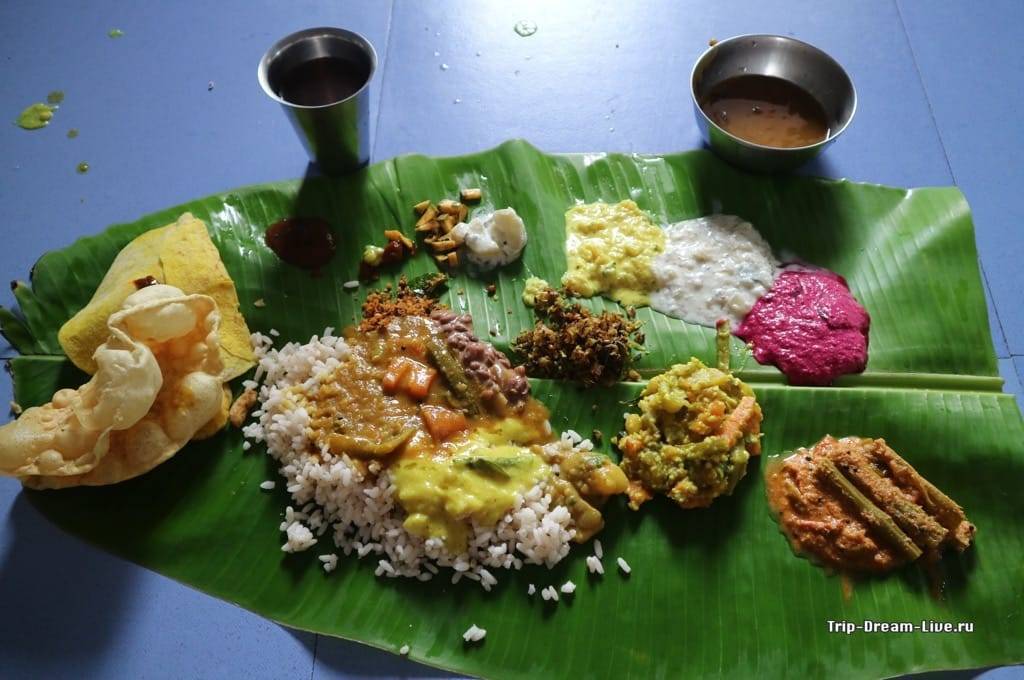 В праздничной Садьи должно быть не менее 4-х блюд, не считая риса, нам же довелось попробовать Садью, состоящую более чем из 20-и блюд. Традиционно Садья сервируется на большом банановом листе вместо тарелки, каждое блюдо на котором, имеет своё определенное место. Например, соленья и уксусные блюда находятся в верхней части левого её угла, бананы и блюда из них — в нижней части левого угла. Есть Садью, в соответствие с керальской традицией, принято руками, а сидеть на циновках (еда при этом находится, соответсвенно, на полу).