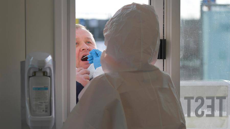 Медицинский работник берет мазок у водителя автомобиля в центре быстрого тестирования на фоне пандемии коронавируса (COVID-19) в Кодерсдорфе