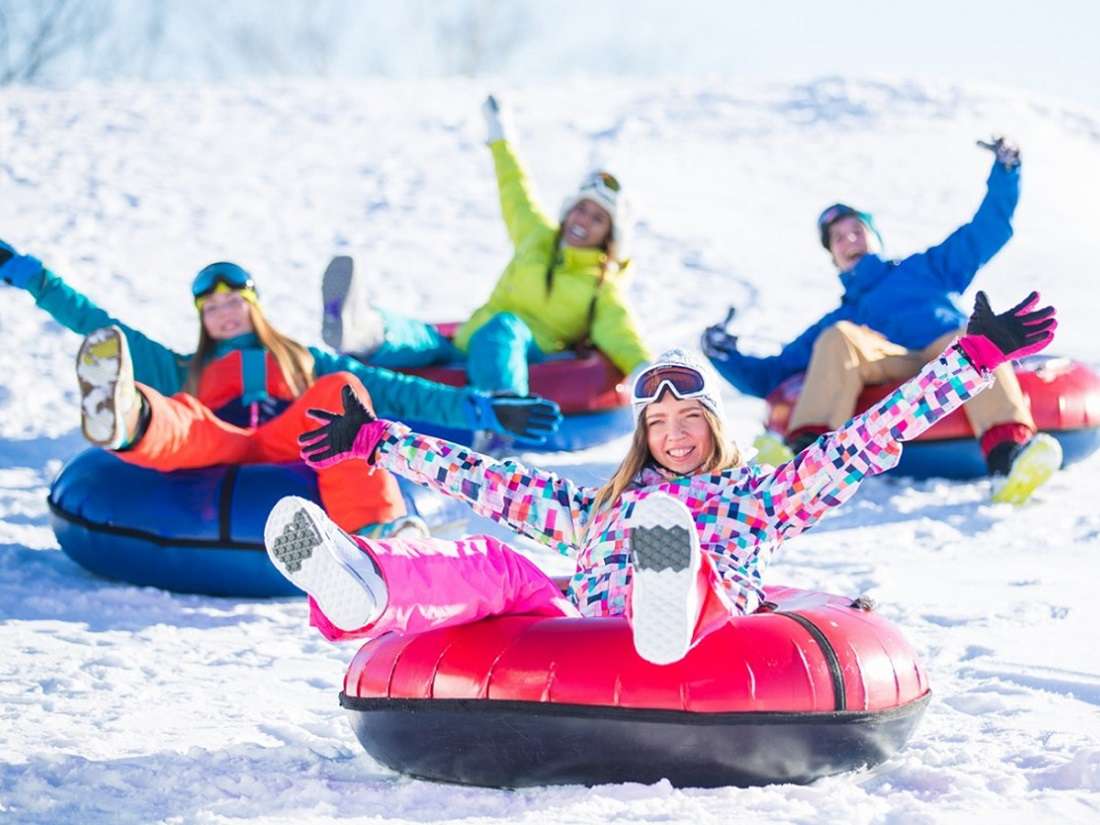 Дети и взрослые могут «с ветерком» спуститься со склона на тюбингах, которые привозят с собой или берут напрокат.
