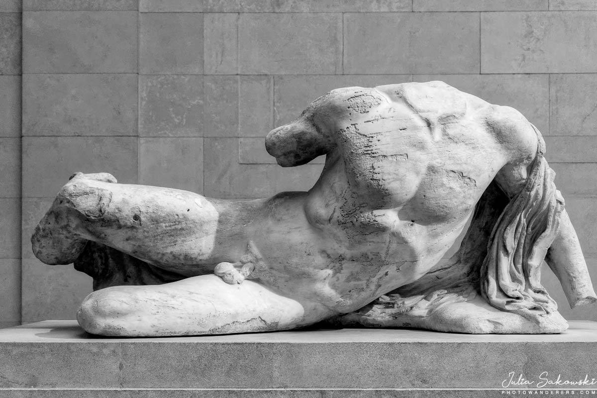 После обеда и короткого отдыха мы продолжили наше приключение и перебрались в древнюю Грецию, где нашли мраморные скульптуры Парфенона. Между 1801 и 1805 годами лорд Элгин, посол Великобритании в Османской империи вывез их из руин Афинского Акрополя и поместил в музей. К статуям можно подойти вплотную, обойти вокруг и увидеть, что даже обратная сторона этих фигур завершена. Изначально они были прикрепрены к фризу и эту часть никто не мог увидеть.