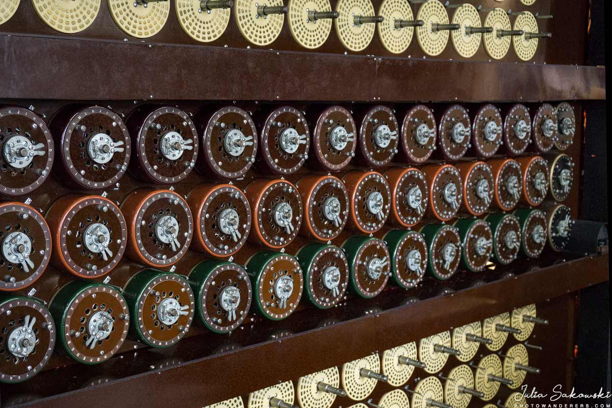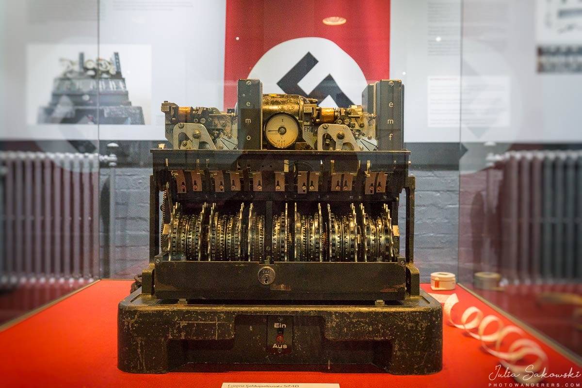 В блоке «B» мы увидели действующую «Бомбу»- электромеханическое устройство, использовавшееся для взлома кода «Энигмы» и саму немецкую шифровальную машину. Энигма похожа на пишущую машинку, только за клавиатурой стоят зубчатые диски.