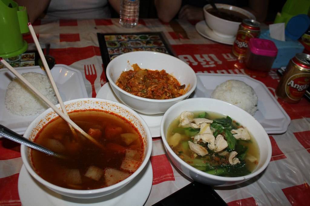Еще до решения своих дел с бизнес визой у нас наиболее остро встал вопрос о питании. Как я написал чуть выше, завтраки были включены в счет номера, однако мы приехали в Сиануквиль к вечеру и в это время никто нас разумеется кормить не собирался. Поэтому первым делом мы пошли искать хоть какую-то еду. Попробовать хотелось местных блюд, поэтому традиционные европейские кафе нас не сильно заинтересовали. Мы направились в самое аутентичное место — к золотым львам, где в вечернее время работает целый ряд местных кафе. Заказали пару супов, не скажу, что очень вкусно, и не скажу что очень дешево, но вполне можно насытиться. А на закуску еще и всяких насекомых пару горстей прикупить. Правда из нас, так никто и не решился их попробовать.