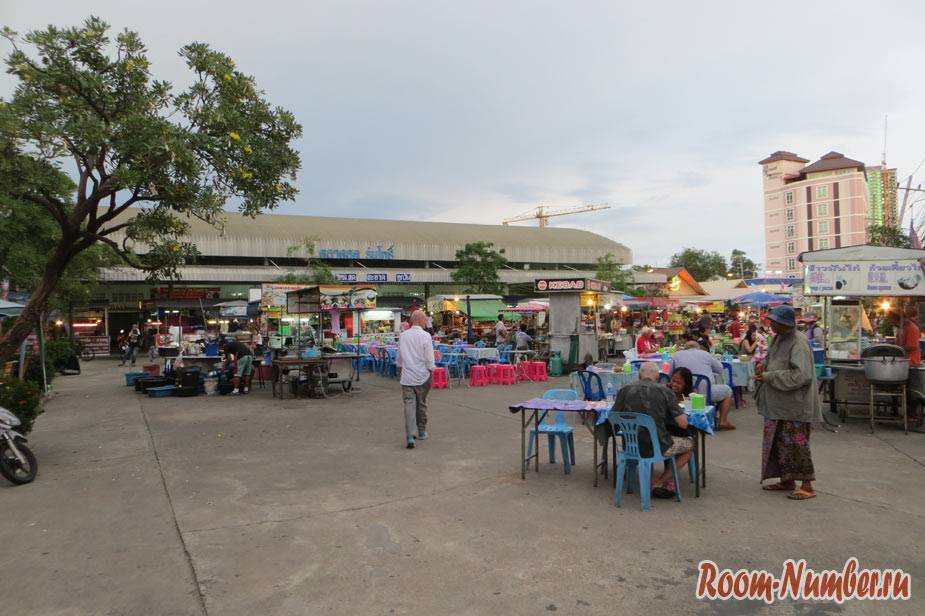 Возле рынка много макашниц со столиками, которые работает и в светлое время суток. Покупаете еду и усаживаетесь за столики на перекус, как тайцы. Лучше приходить ближе к 6 вечера, чтобы не сидеть на солнцепеке, так как тенька нет. Есть пару кафешек с европейской едой, более дорогих. А также есть целая улица с барами и тайками (Rompo road), в которых обычно всегда сидят евро-деды.