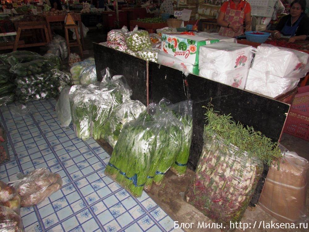 А еще на этом рынке продается много зелени и мой любимый пряный ароматный укроп. Как будто его только что сорвали с грядки! Я покупаю одну веточку и кушаю её всю неделю! Стоит веточка, а точнее сказать ветвище укропа, всего 10 бат (0,3$). В то время, как в Теско и Фудмарте укропчик в два раза меньше продается за 15 бат. Да еще и не такой сочный, как здесь.