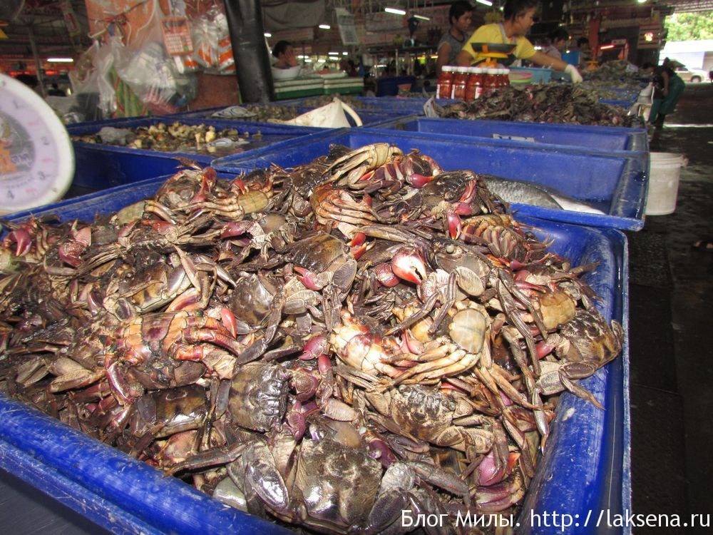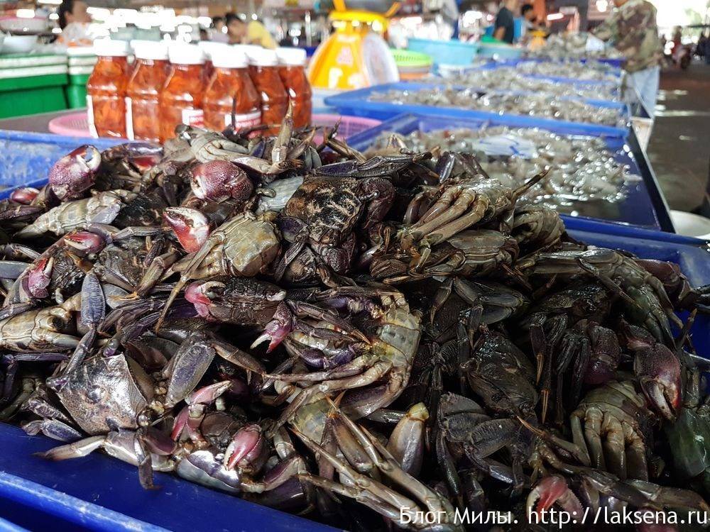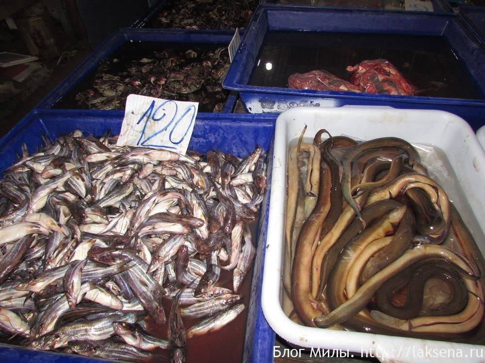 и морепродуктов (большая часть морских и речных жителей еще шевелится). Выбор морепродуктов здесь гораздо уже, чем на рыбном рынке Наклыа, конечно же, но всё же есть, из чего выбрать.