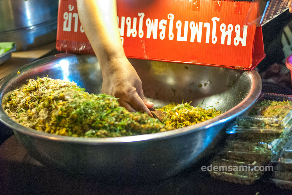 Про рынок Пхукет-Тауна я напишу отдельно, ибо написать никак нельзя: это самый колоритный и атмосферный из всех ночных рынков Таиланда, что мне до сих пор встречались, честно! Помимо завораживающей атмосферы рынок может похвастаться отличным выбором съестного. Блинчики, шашлычки, нарезанные фрукты, мороженое (все это мы, само собой, заценили) – и более сложные блюда. Я, в частности, на рынке приобщилась к еще одному местному блюду, кхао ям.