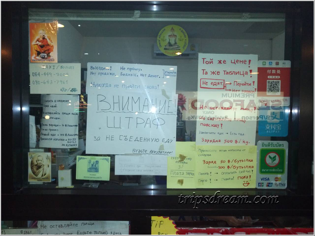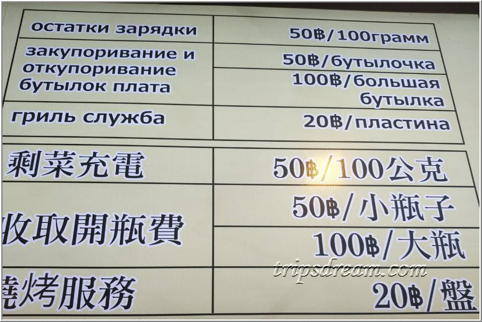 За оставленную еду (или, как творчески перевели тайцы, «остатки зарядки») предусмотрен штраф (50 бат за 100 грамм), а за принесенные напитки взимается пробковый сбор (50-100 бат в зависимости от бутылки). Об этих сборах напоминает уже другое объявление: