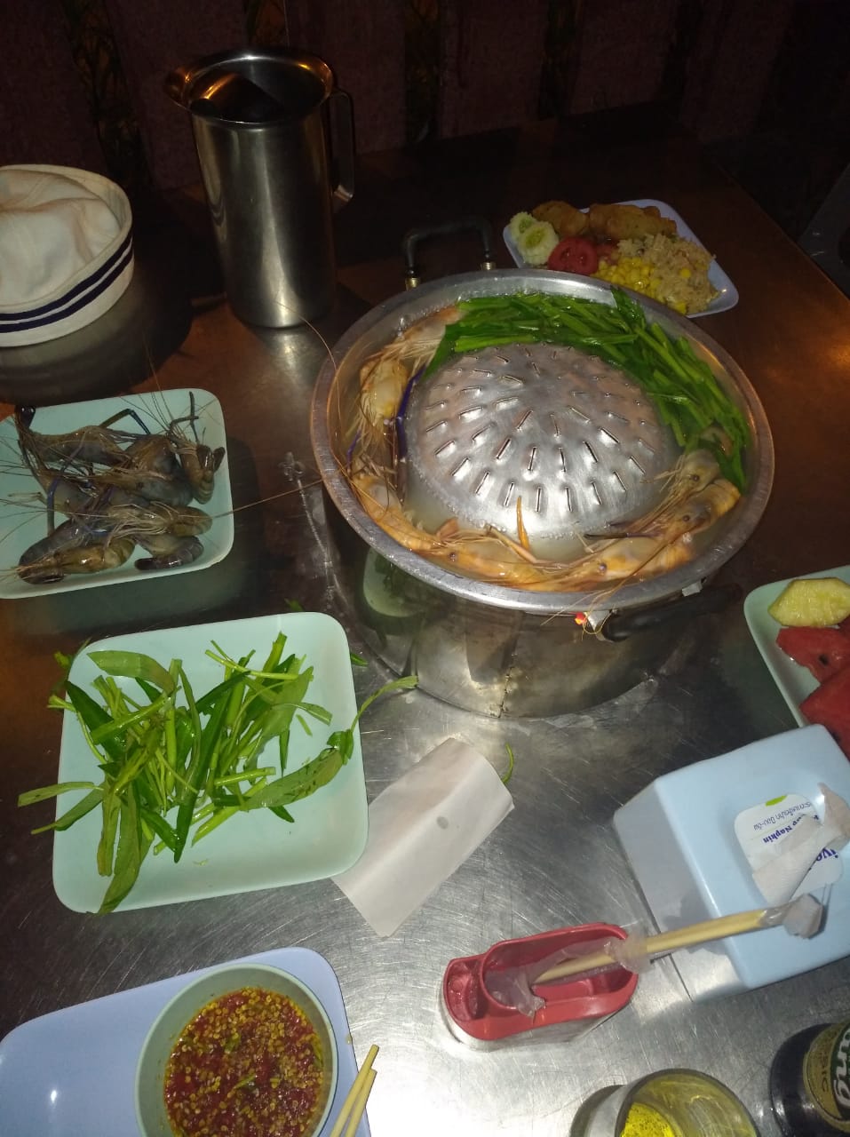 Мы посмотрели на других посетителей (к слову, только мы тут были в тот момент из европейцев), заказали мясо и морепродукты, закуски и стали сами готовить себе блюдо. Дополнительно (бесплатно) принесли капусту и бульон. Мы обжаривали мясо на возвышении, а внизу бурлил бульон, в него иногда скатывалось мясо и там же слегка обваривалась капуста. Было необычно и вкусно, такая особая церемония приобщения к чужой культуре. Недешево это обошлось, но и не так уж дорого для таких кулинарных впечатлений.
