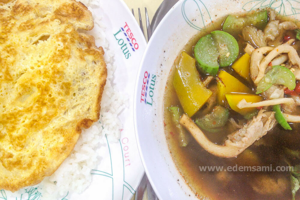 Такие шопы есть и в других фудкортах, но в Теско подают просто-таки огромные порции. Почти все острое: если надо палехче, обязательно предупредите. К плошке супа идет честная плошка риса с омлетом. Я люблю брать зеленое карри, гэнг кьяо ван. На фото карри с грибами – тоже ничего.