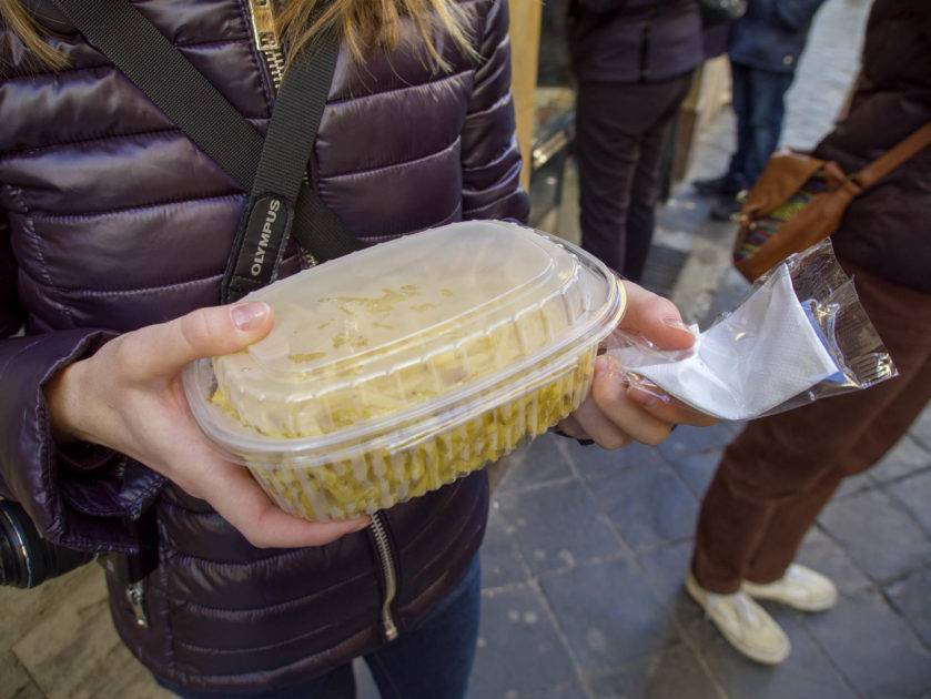 Второе заведение: Pastasciutta — паста за 6 евро рядом с Ватиканом. На выбор 6 вариантов и готовят при вас. Порции средние, обычные, соус тоже довольно простой. Подается в картонном контейнере или тарелке с пластиковой вилкой. Перекусить можно на месте или рядом.